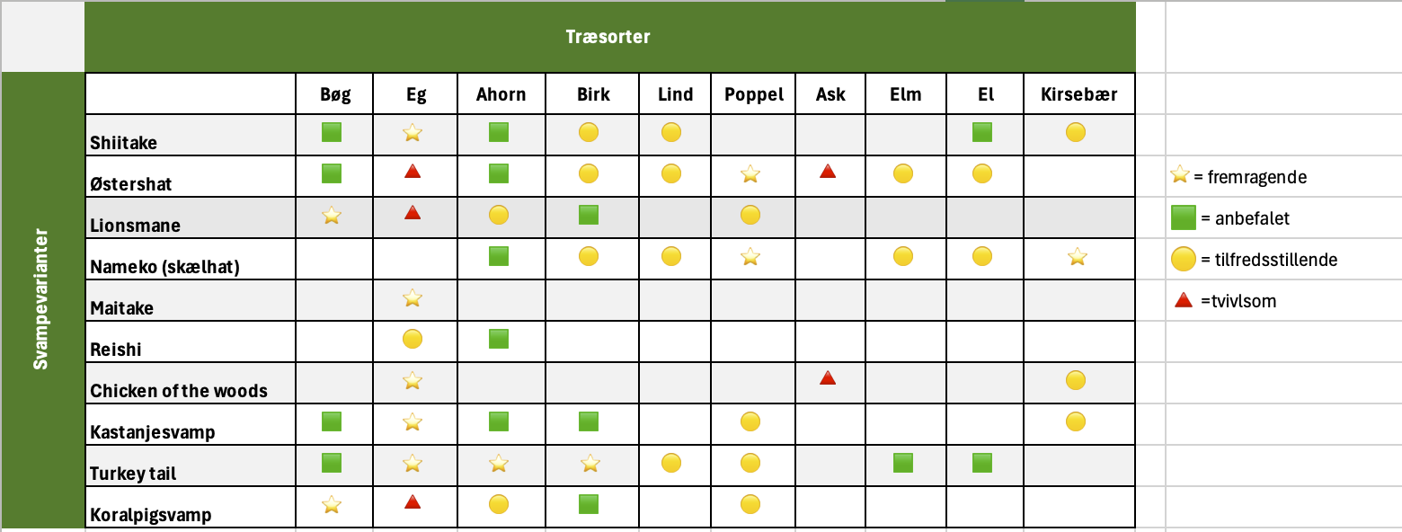 En oversigt over hvordan forskellige svampe og træsorter - ofte - spiller sammen. Denne oversigt skal ses som en vejledning, og ikke den eneste sandhed. En svampeart har oftest flere varianter som kan have bestemt tilknytning til en lokalitet - klima - træart mv.